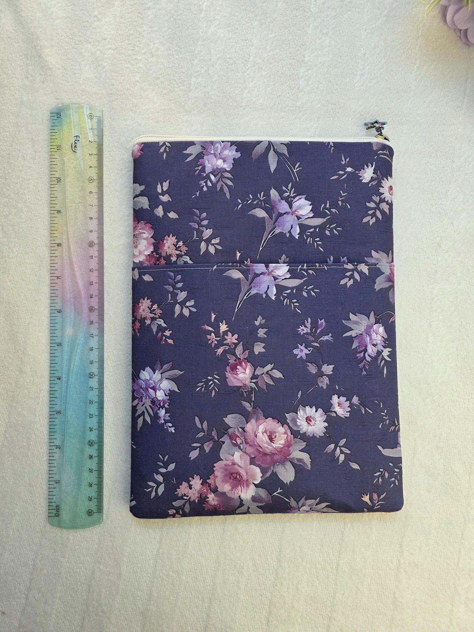 The floral print in calming purple tones gives it a timeless look, suitable for readers, students, and professionals alike. The secure zipper closure keeps everything neatly in place, while the front pocket is ideal for storing a phone, pen, notebook, or small accessories. It can also be used as a sleeve for kindles or journals of compatible size.