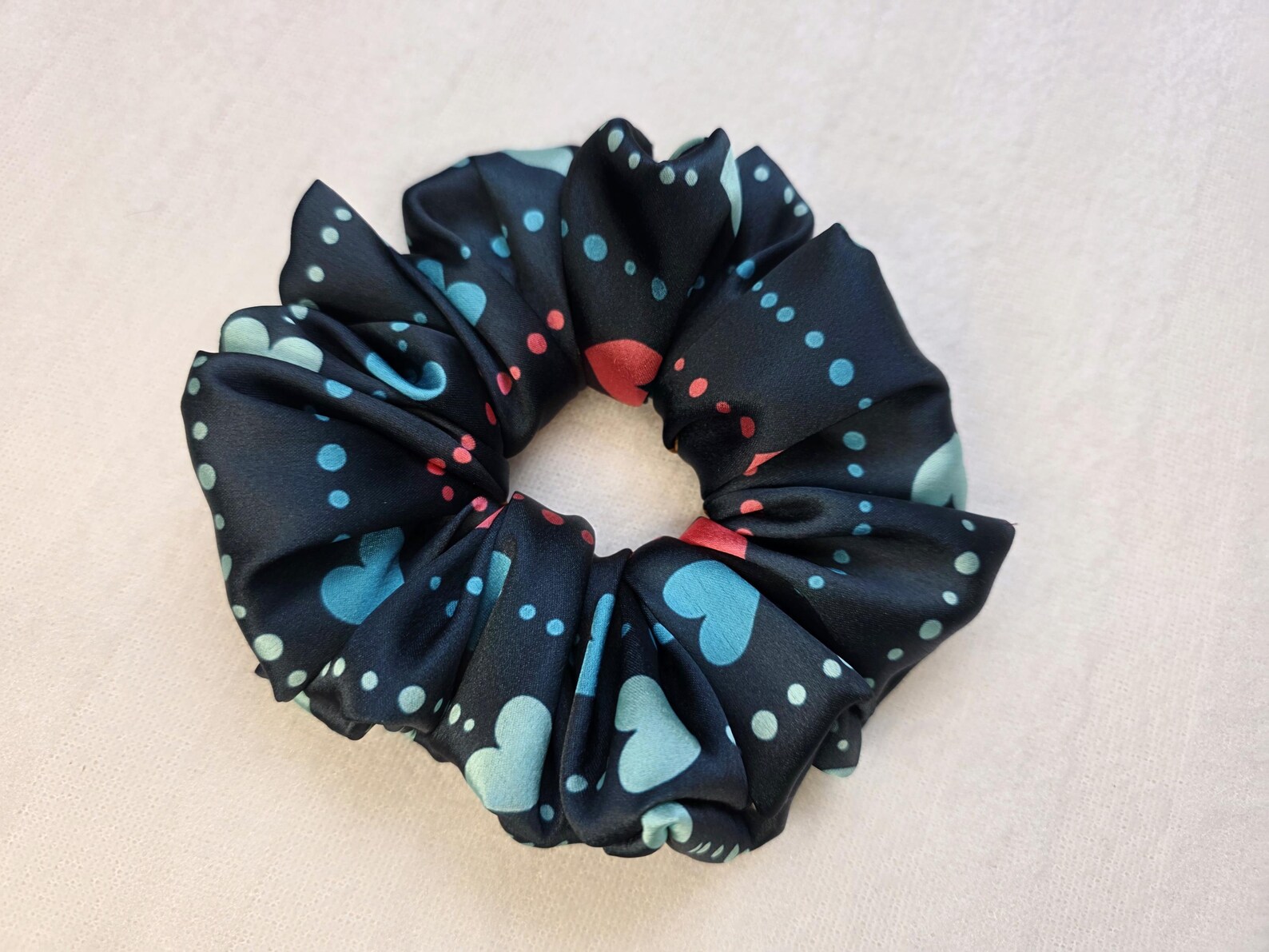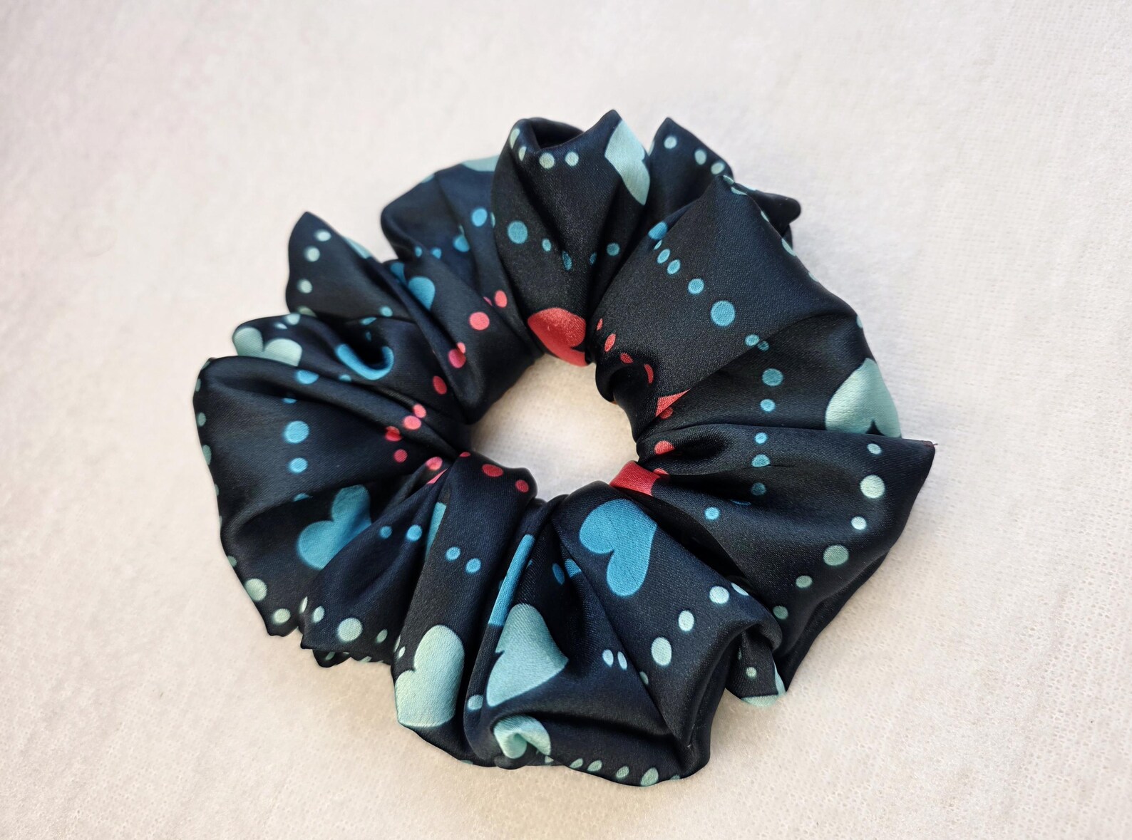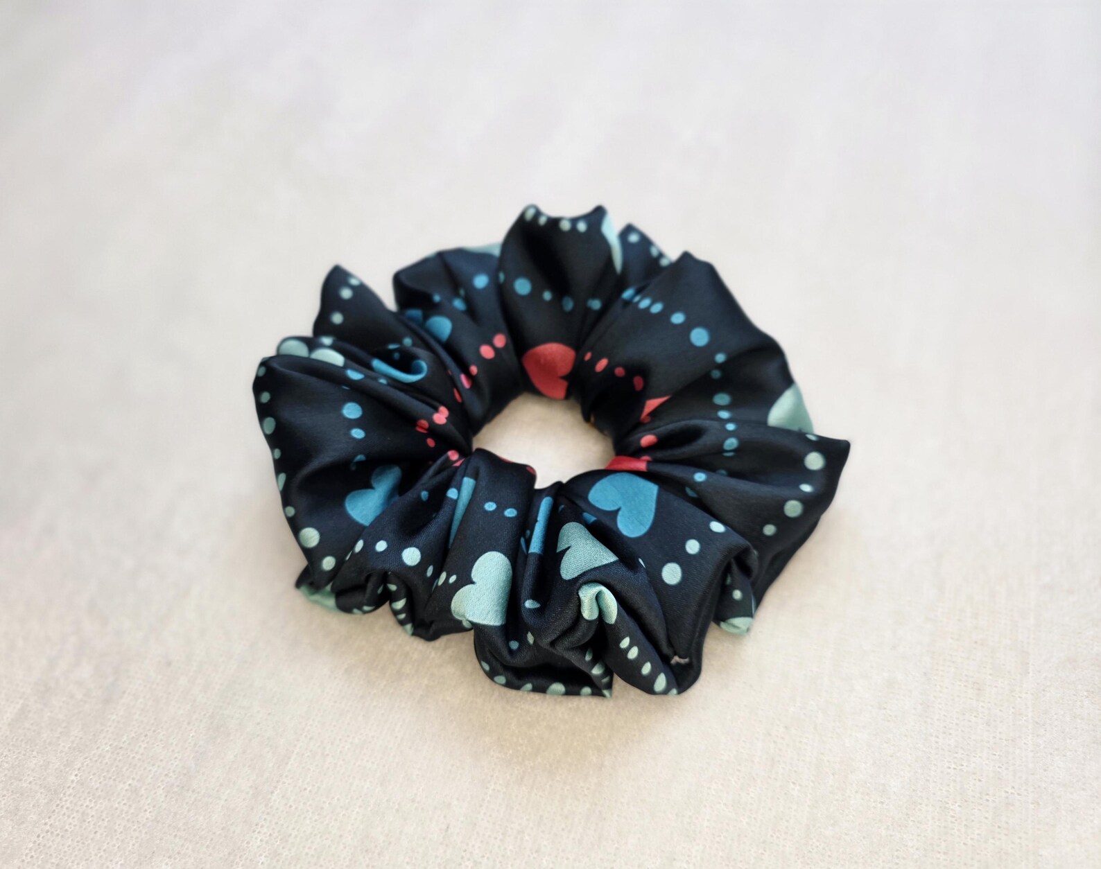 This heart print satin scrunchie is handmade using soft, smooth satin fabric that’s gentle on your hair and perfect for everyday wear.
