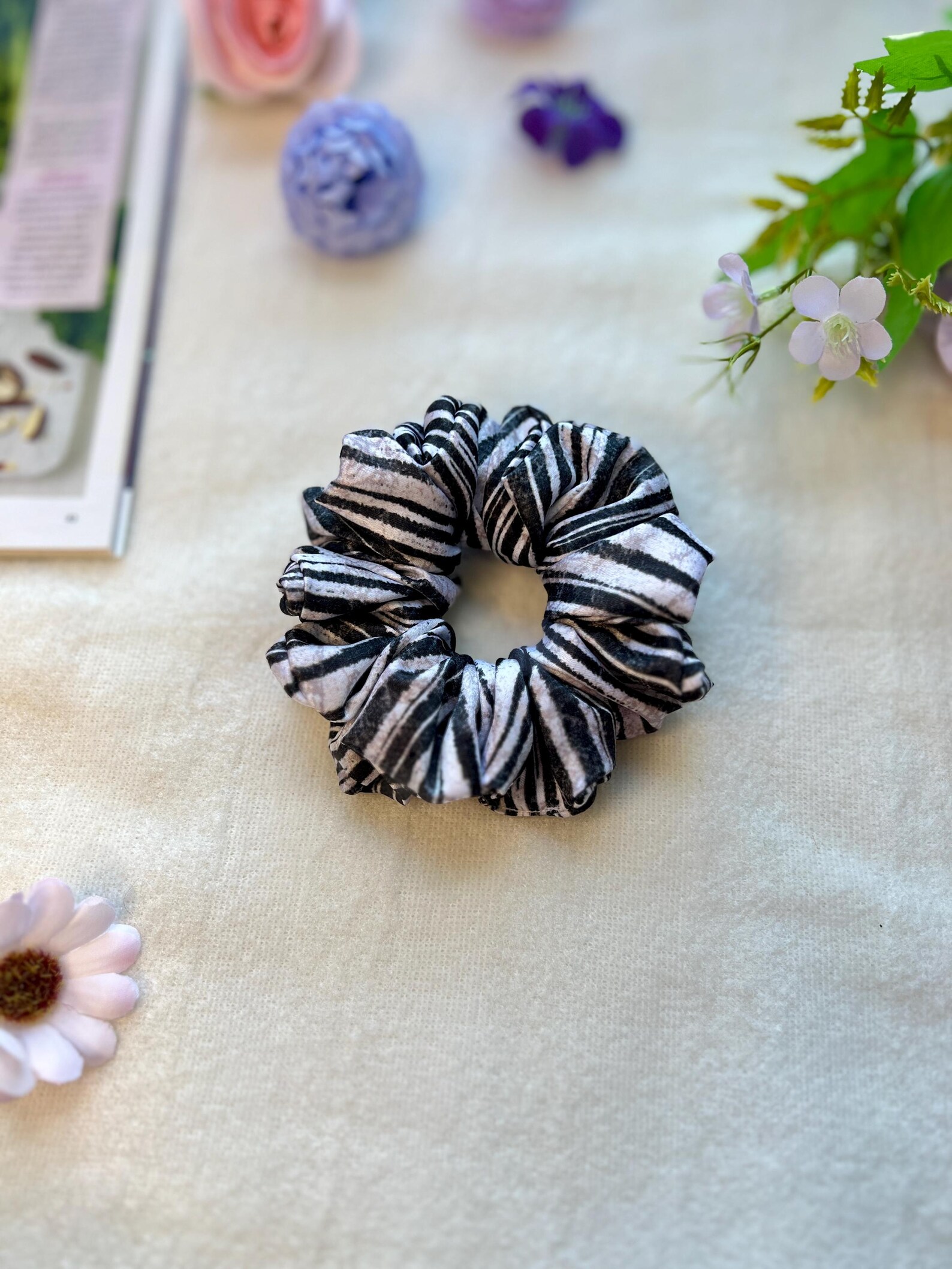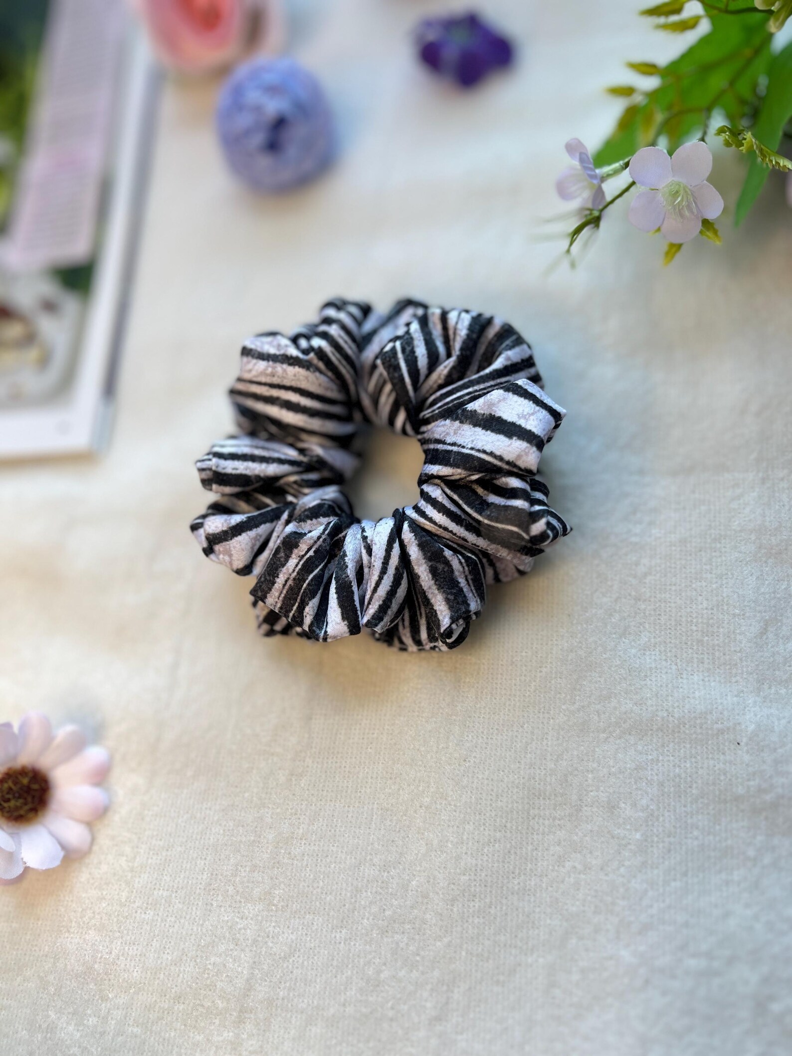Be the first to review “Lush Satin Scrunchie: Black and White Striped Hair Tie”