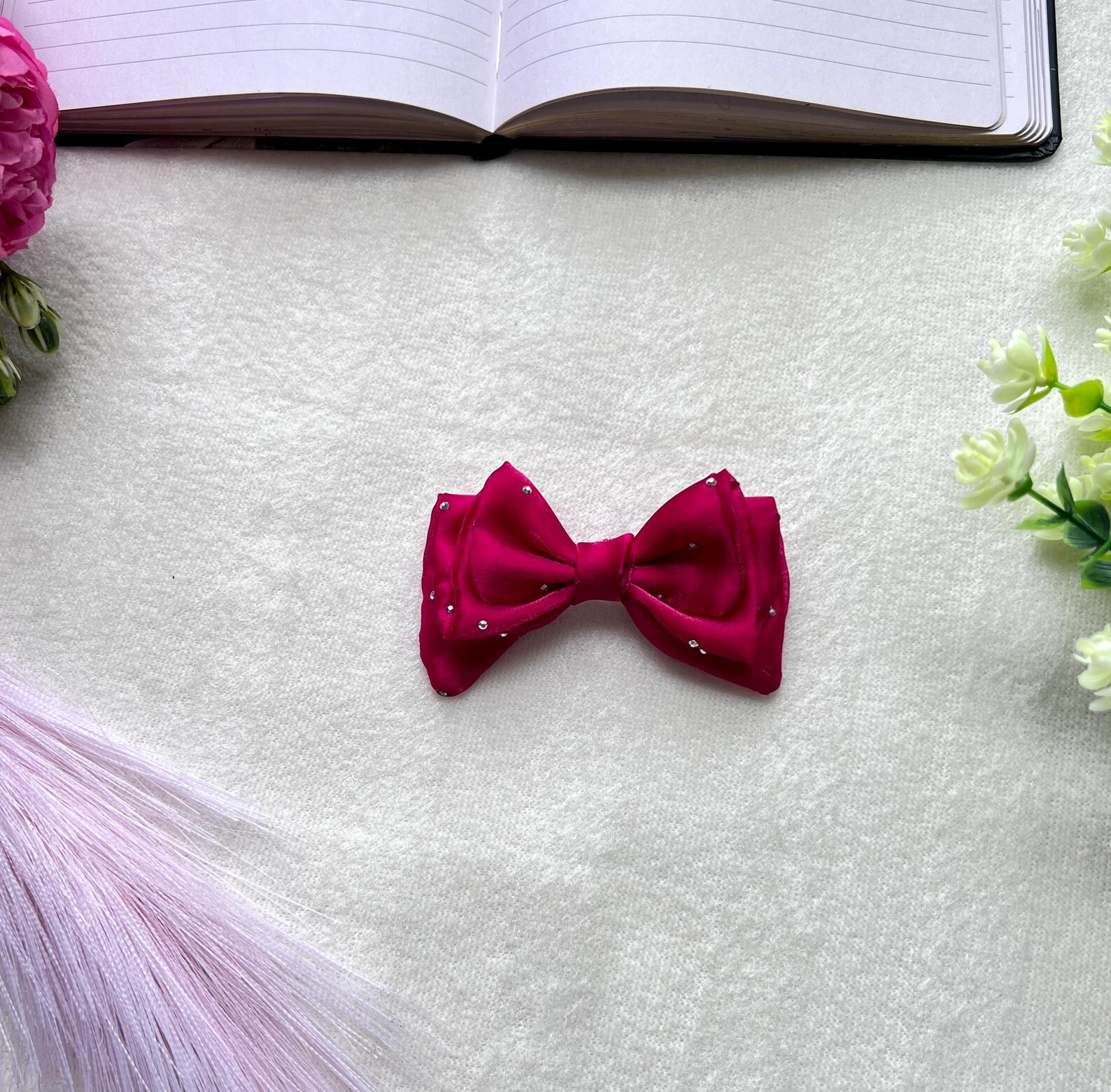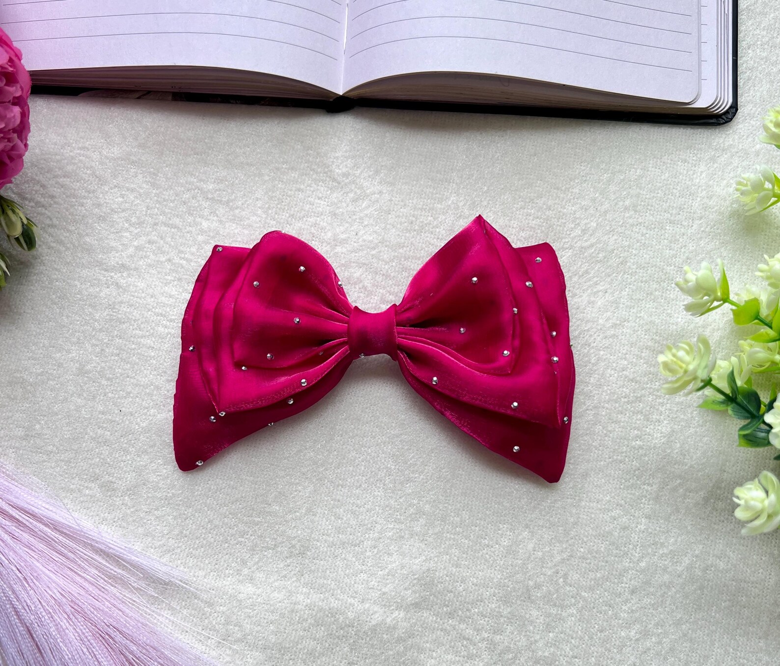 Add a touch of sophistication to any outfit with this stunning magenta organza bow clip. Crafted from high-quality organza, this bow radiates a luxurious sheen, making it perfect for special occasions or adding a pop of color to your everyday look. The fabric is adorned with subtle, sparkling embellishments, giving the bow a refined and glamorous feel.